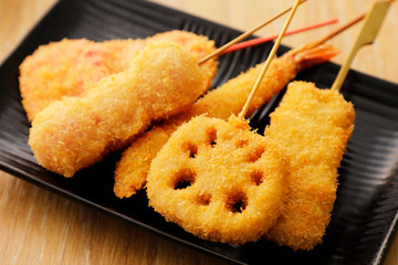 Kushikatsu are skewered ingredients coated in batter and deep-fried.
