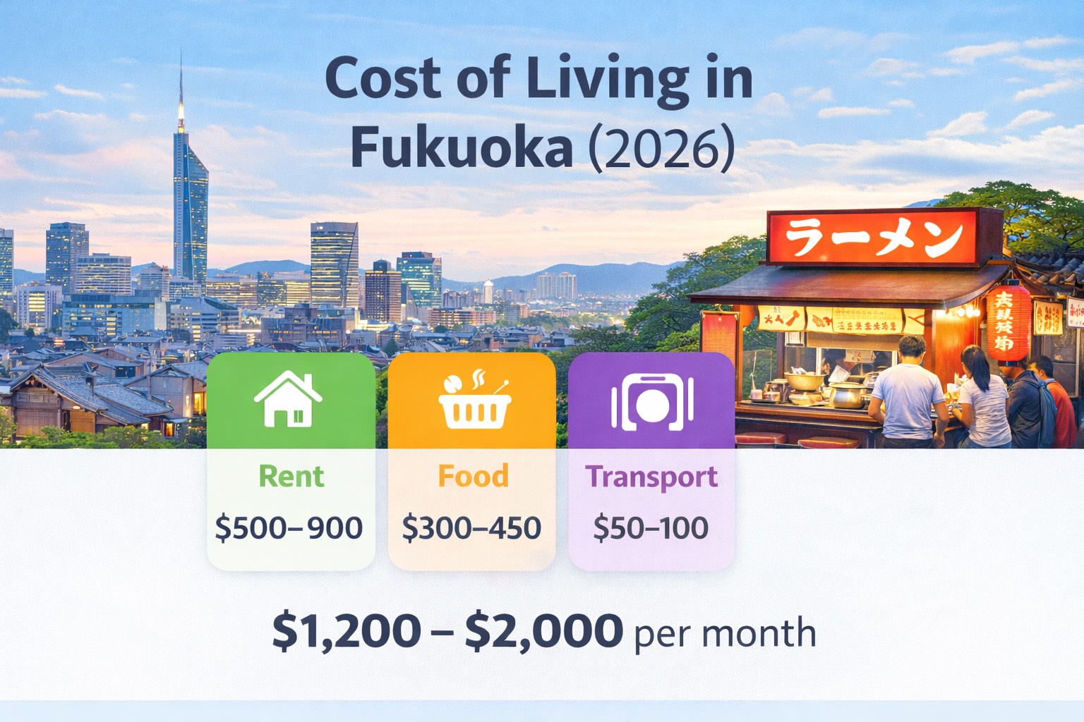In 2026, the average cost of living in Fukuoka for a single person typically ranges between $1,200 and $2,000 per month, depending on lifestyle and housing choices.