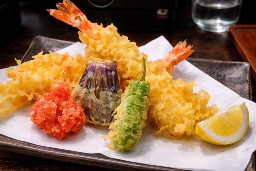 Shrimp and seasonal vegetables in a thin, crisp batter.