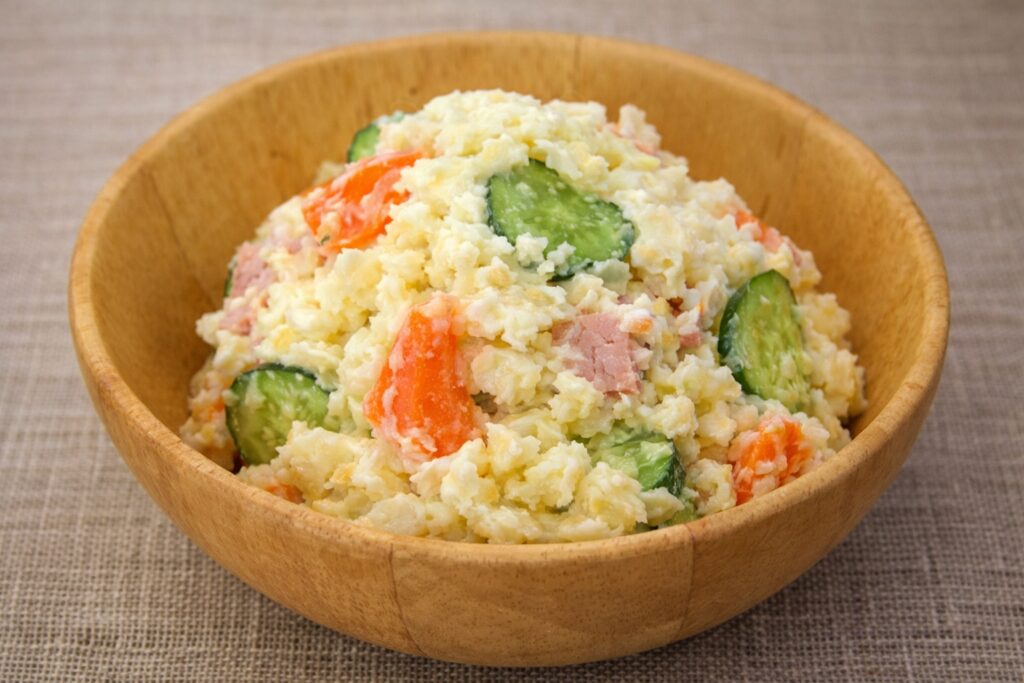 Mixed with mayo, dashi, and finely chopped vegetables.