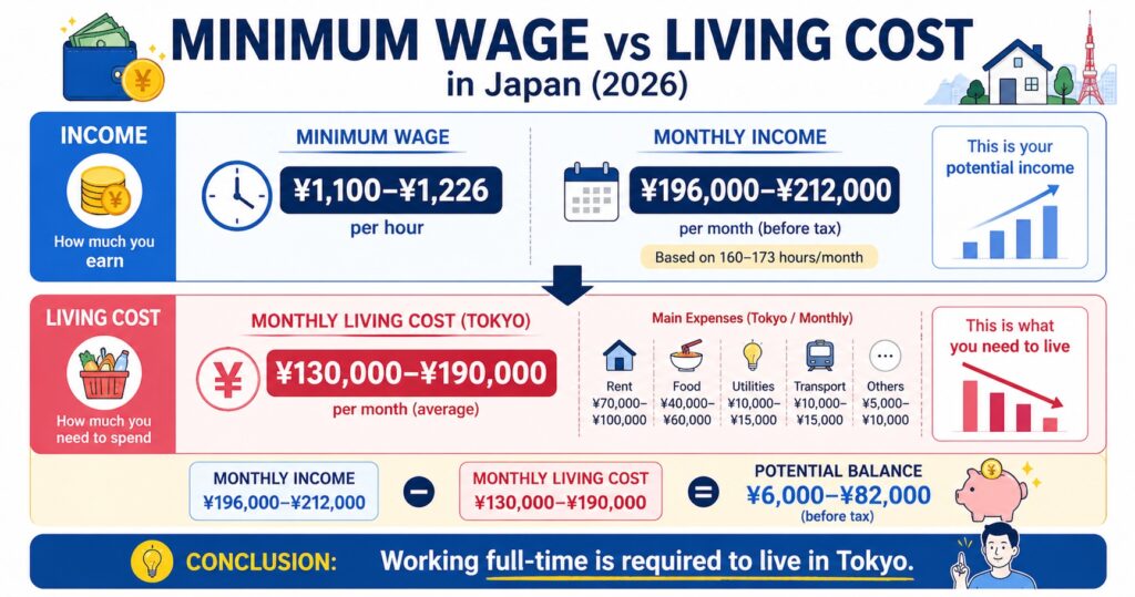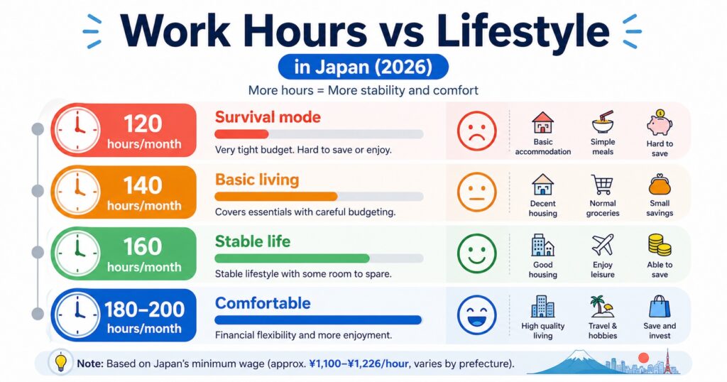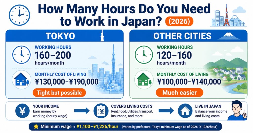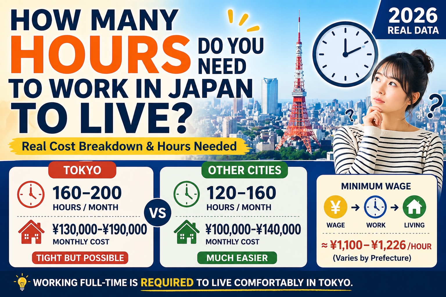 This guide explains the real working hours needed to survive and live in Japan in 2026, based on actual wages and living costs.