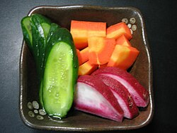 Cucumbers, radishes, or eggplants are salted or fermented, creating a light, tangy, and refreshing flavor.